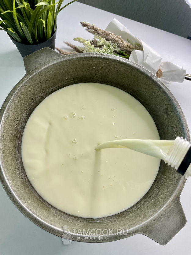 Переливаем молоко в казан. Ставим на плиту. После того как молоко закипит, уменьшаем огонь. Нужно, чтобы молоко не кипело, а томилось 1 час.