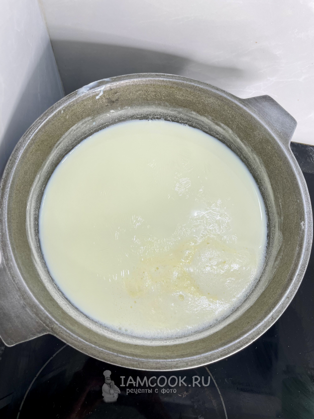Через час снимаем молоко с плиты и даём ему остыть. Остывшее молоко убираем в холодильник на сутки.