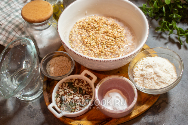 Соберите необходимые продукты для выпечки булочек из зеленой гречки. Зеленую гречку предварительно замочите в холодной воде на 10-15 часов. Вода должна полностью покрыть гречку.