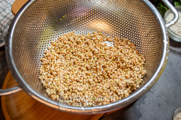 Замоченную гречку откиньте на сито и хорошо промойте под проточной водой, затем откиньте на сито, чтобы вся лишняя вода стекла.
