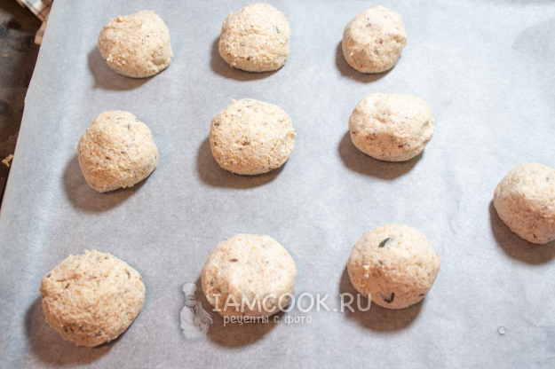 Слегка влажными руками сформируйте небольшие шарики и переложите их на противень, выстеленный пергаментом. Выпекайте в заранее разогретой до 180 градусов духовке 35-40 минут. Готовность проверьте деревянной шпажкой, она должна выйти из середины булочек абсолютно сухой.