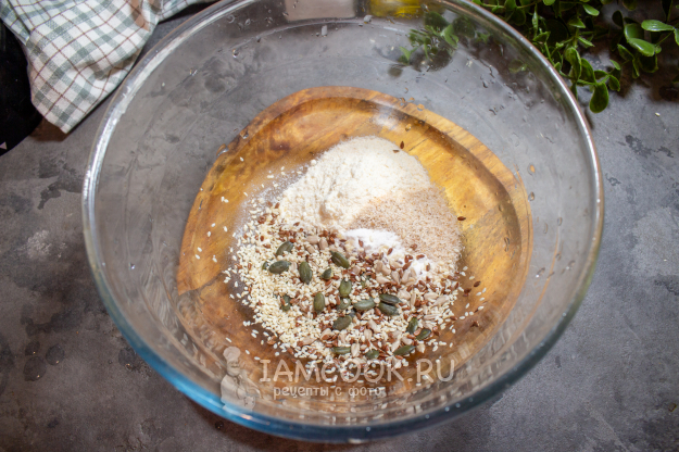 Отдельно смешайте кокосовую муку, псиллиум, семена льна и кунжута, пищевую соду и тыквенные семечки.