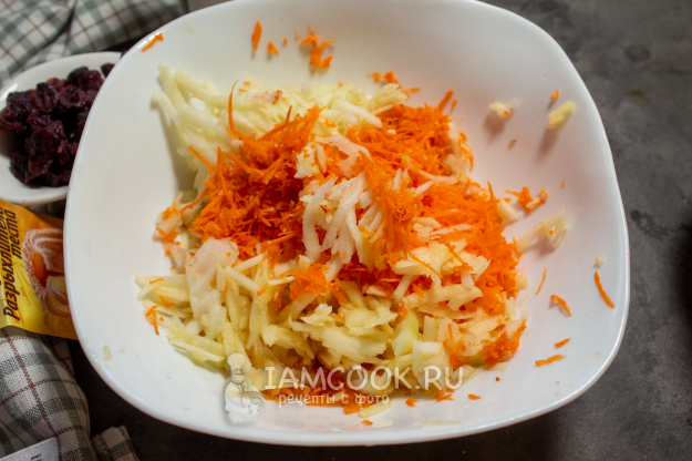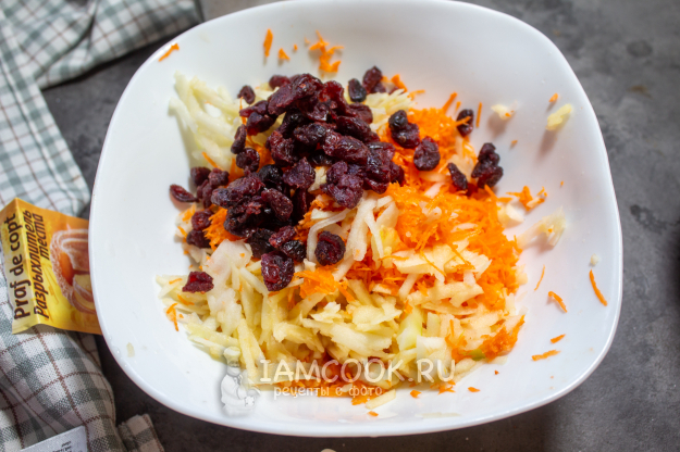 Вяленую клюкву промойте и обсушите, добавьте к натертым яблокам и моркови.