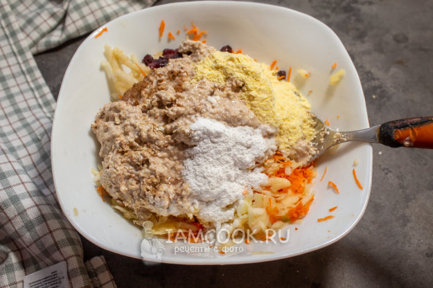 К натертым яблокам и моркови добавьте набухшие отруби, кукурузную муку и разрыхлитель.