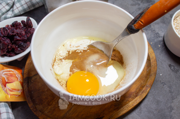 В подходящую миску выложите сметану, добавьте яйцо, сахар и корицу. Перемешайте.