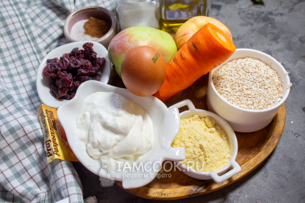 Соберите необходимые продукты для приготовления морковно-яблочных оладий. Мне нравится в такую выпечку добавлять немного сухофруктов. Я добавила сушеную клюкву, которую по желанию можете заменить на изюм, чернослив или другие сухофрукты.