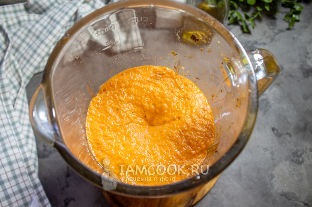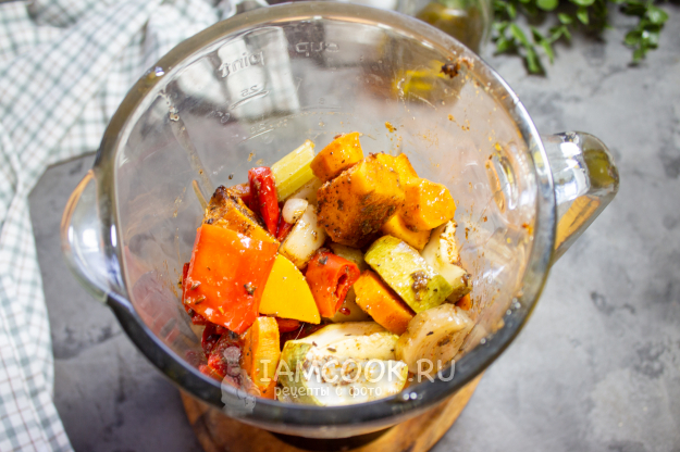 Измельчите овощи в однородное пюре. На этом этапе, если вам нравятся более жидкие супы-пюре, влейте еще немного бульона (воды) и пробейте еще раз до однородности.