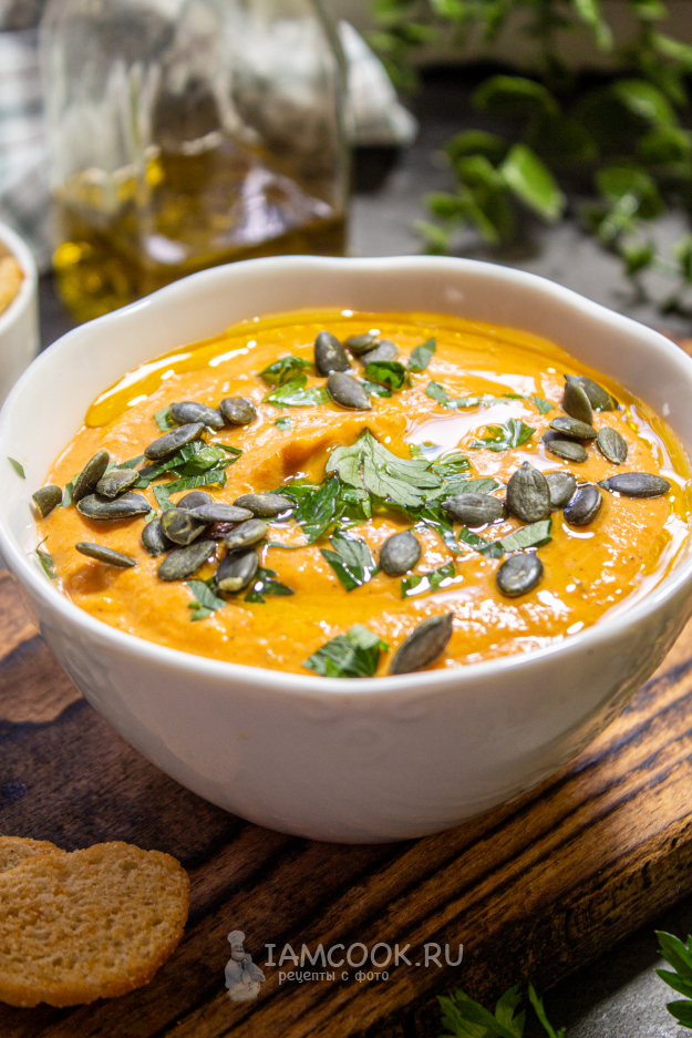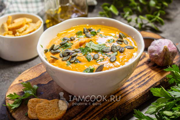 Наш тыквенный суп-пюре в духовке готов! Подавайте его с крутонами, посыпав тыквенными семечками и зеленью.