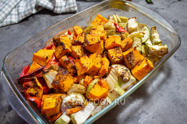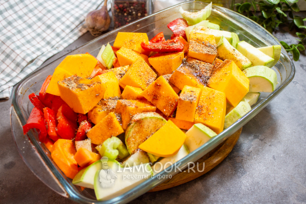 Все подготовленные овощи переложите на противень или в форму для выпечки, добавьте специи и масло. Перемешайте и поставьте в разогретую до 180 градусов духовку на минут 40. Форму с овощами можете накрыть фольгой.