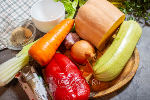 Соберите необходимые продукты для приготовления тыквенного супа-пюре в духовке. Если вам нравятся более сытные супы, то кабачок можно заменить на картофель. А специи вы можете выбрать на ваше усмотрение.