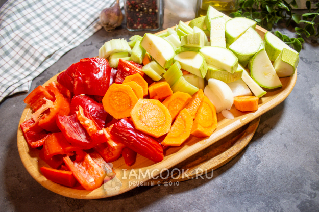 Овощи помойте и обсушите. Нарежьте их средними кусочками.