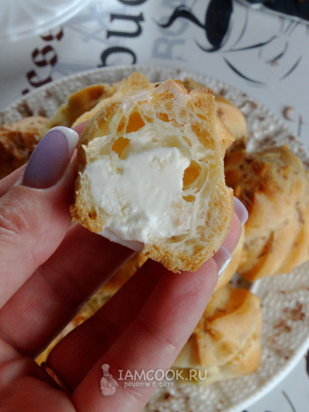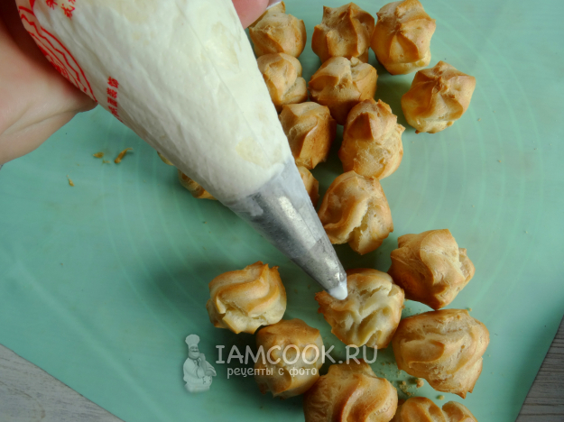 2. Разрезать профитроли пополам. Ложкой заполнить пустоту заварнушки.