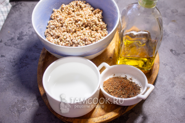 Соберите необходимые продукты для приготовления вафель из зеленой гречки. Гречку замочите в холодной воде часов на 10-15. Вода должна полностью покрыть крупу.