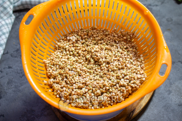 Замоченную зеленую гречку откиньте на сито и промойте под проточной водой. Дайте стечь лишней воде.