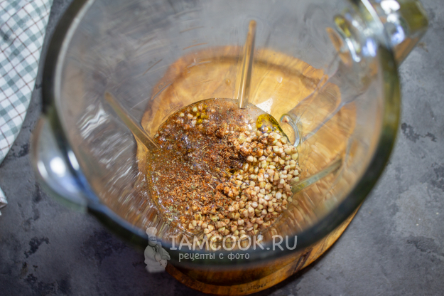 В блендер поместите гречку, специи, соль и масло. Влейте холодную питьевую воду. Если вы хотите получить более тонкие и хрустящие вафли, то налейте немного больше воды. Чем реже тесто, тем тоньше получатся вафли. Если хотите испечь сладкие вафли, то специи не добавляйте, а добавьте подсластитель и ароматизатор.