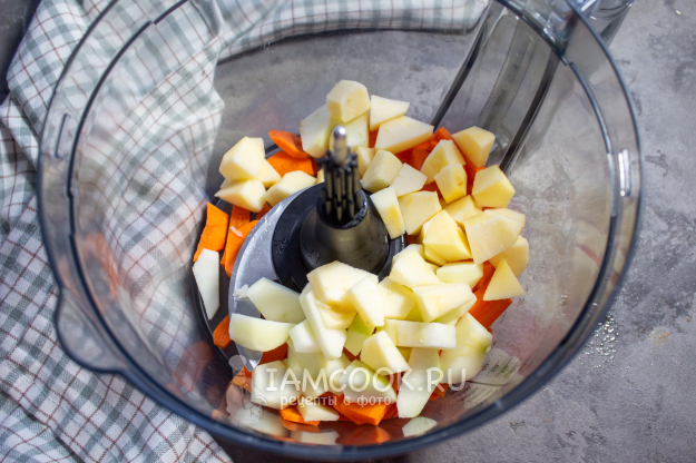 Яблоки и морковь очистите и нарежьте небольшими кусочками. Отправьте в чашу измельчителя.