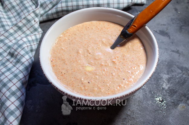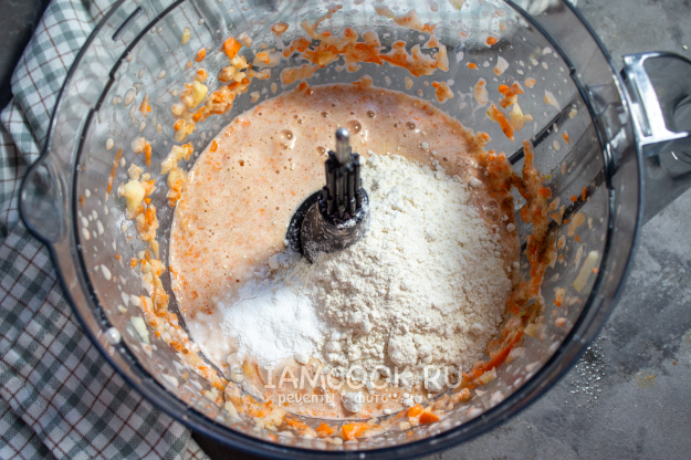Должна получиться однородная масса. К полученной массе всыпьте муку и разрыхлитель и перемешайте до полного соединения продуктов.