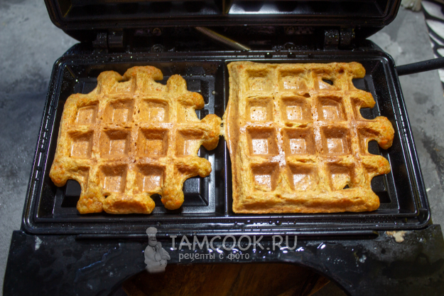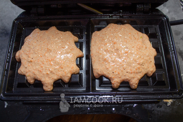 Вафельницу разогрейте и сбрызните растительным маслом. Выложите тесто и выпекайте вафли в течение 4-5 минут.