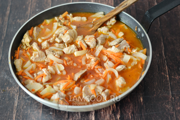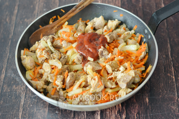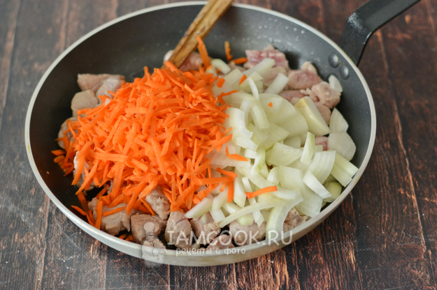 К обжаренной свинине добавьте нарезанный мелко лук и натертую на терке морковь. Обжарьте их вместе еще 5-7 минут, периодически помешивая.