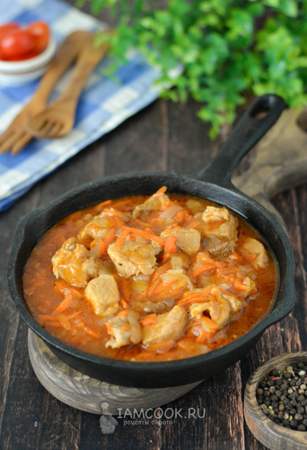 Гуляш из свинины с кетчупом готов. Он очень насыщенный и ароматный и хорош с любым гарниром.