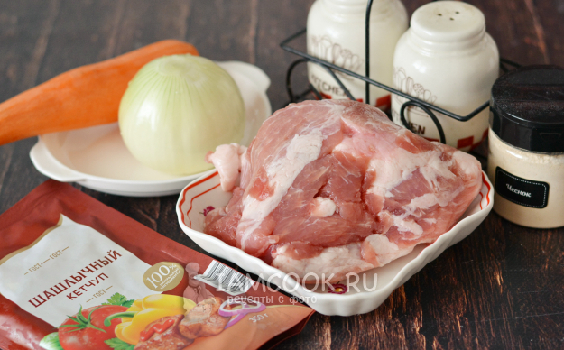 Соберите все необходимые продукты для приготовления гуляша из свинины с кетчупом.