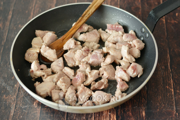 Нарежьте свинину на кусочки примерно 2х2 сантиметра. Разогрейте сковороду и слегка обжарьте свинину, 3-5 минут на сильном огне. Поскольку у меня свинина с жирком, то я не добавляю дополнительно масло.