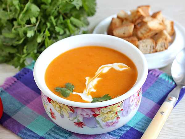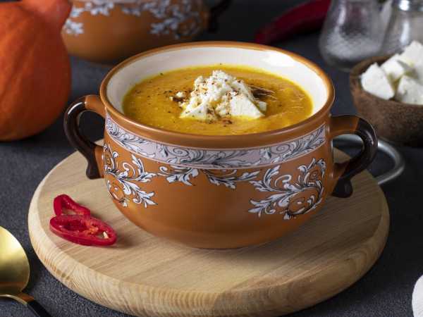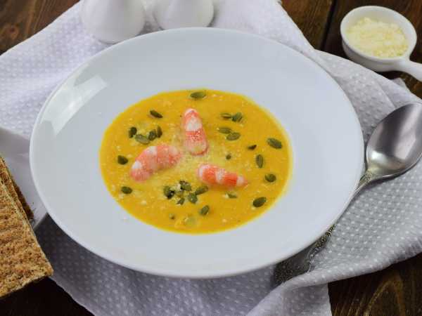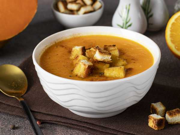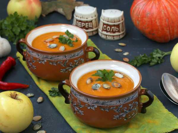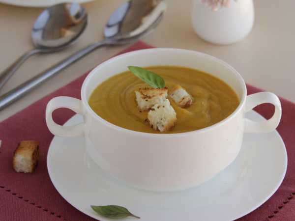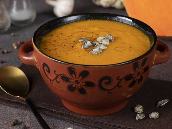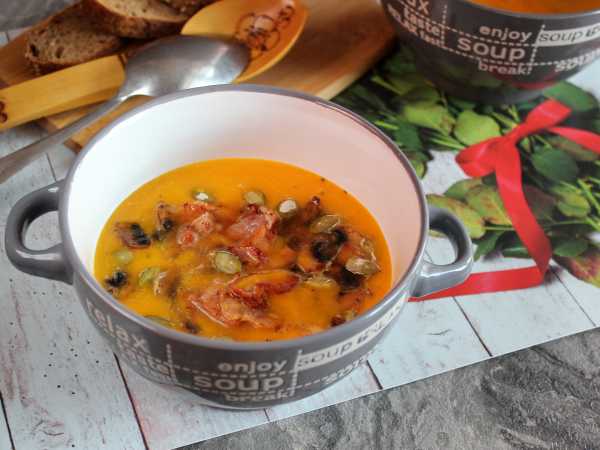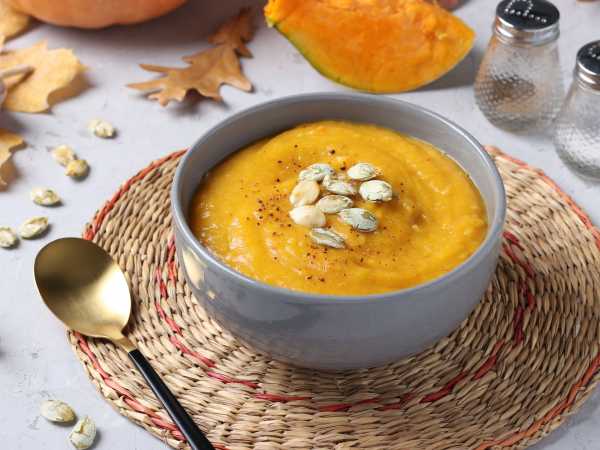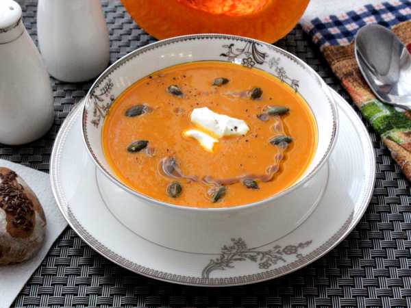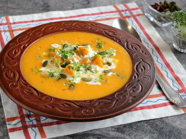 Переложите овощи вместе с жидкостью в чашу блендера и измельчите в однородное пюре. Если любите супы более жидкие, то добавьте немного кипяченой воды. Верните тыквенный суп-пюре в кастрюлю и доведите его до кипения.