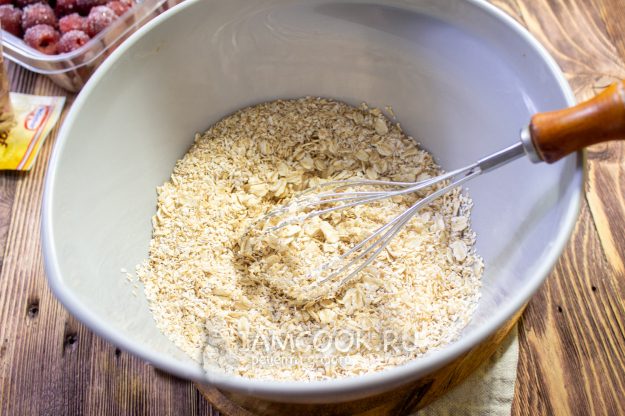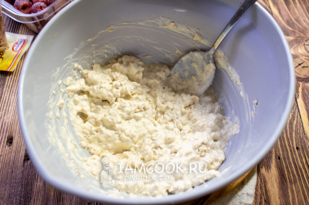 Добавьте разрыхлитель, перемешайте массу и оставьте минут на 10-15, чтобы хлопья немного набухли.