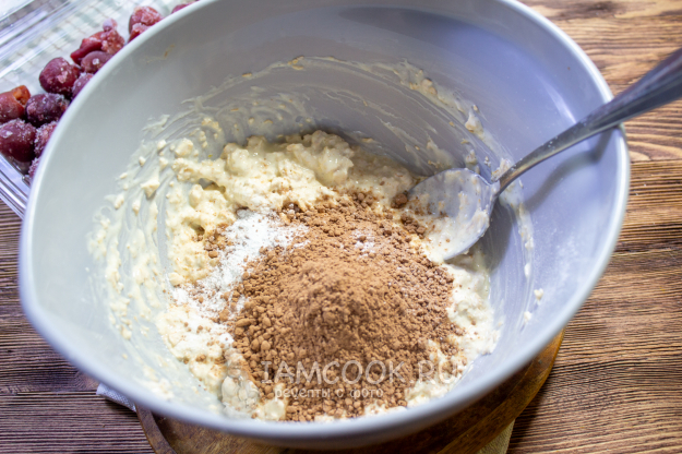 К тесту добавьте какао-порошок. Перемешайте ингредиенты.