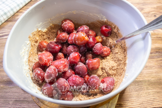 Добавьте замороженную вишню, не размораживая ее. Аккуратно перемешайте тесто.