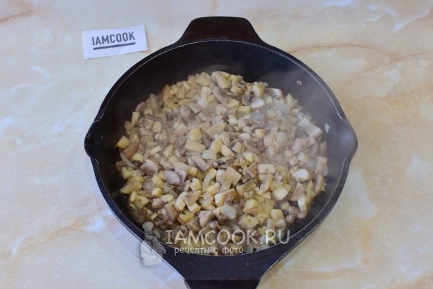 Затем добавьте мелко нарезанные шампиньоны и обжаривайте их вместе с луком 7-10 минут. За время жарки они уменьшатся в размере. Немного подсолите.