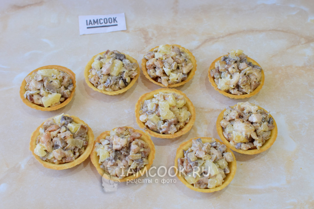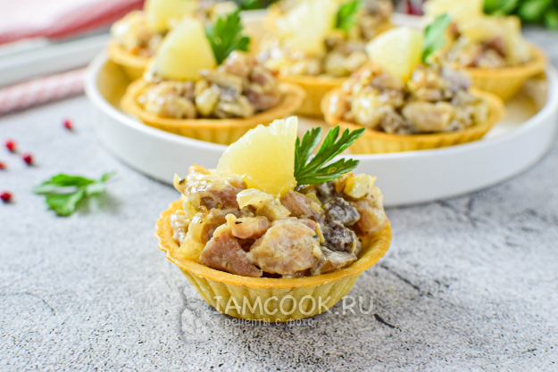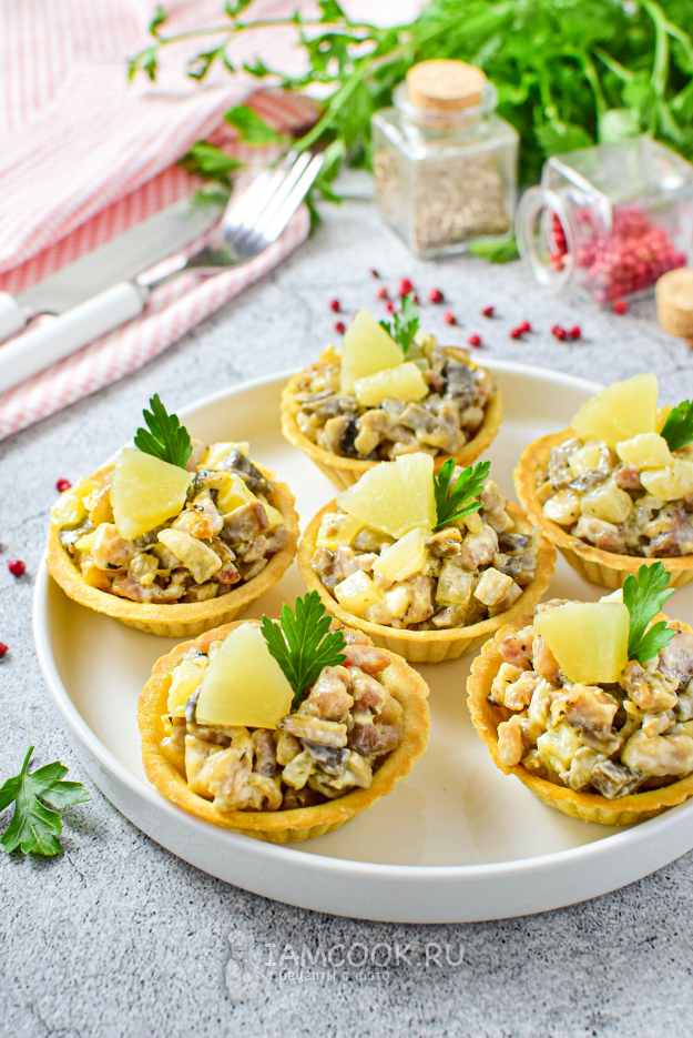 Украсьте на свой вкус и сразу подавайте к столу - тарталетки с курицей, грибами и ананасами готовы.