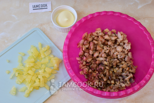 В чаше соедините курицу и грибы. Добавьте нарезанные ананасы и заправьте майонезом. Совсем немного, только для связки ингредиентов. Майонез можно заменить на сметану.