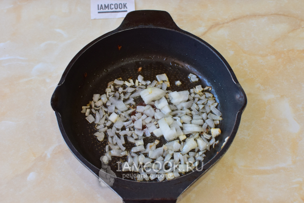 Лук очистите, мелко нарежьте и обжарьте 1-2 минуты, до прозрачности.