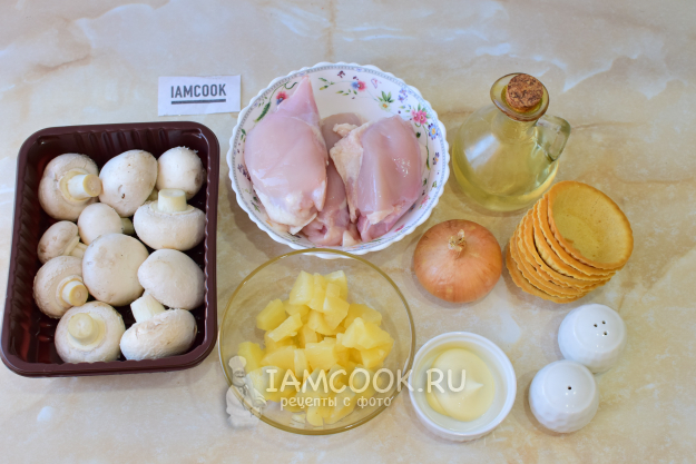 Чтобы приготовить тарталетки с курицей, грибами и ананасами, соберите необходимые ингредиенты по списку. В качестве куриного филе я беру филе бедер - оно сочнее, чем филе грудки. С консервированных ананасов слейте жидкость.