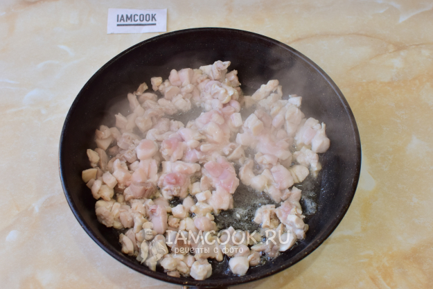 Одновременно с грибами на другой сковороде обжарьте куриное филе, нарезанное мелкими кусочками. На жарку уйдет 12-15 минут. По вкусу подсыпьте соль и специи. Обжаренную курицу и грибы остудите.