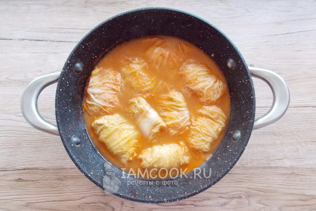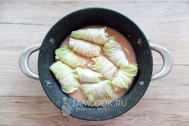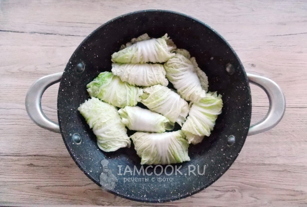 Каждый лист капусты заполните фаршем и сверните конвертом. Выложите в глубокую сковороду, сотейник или кастрюлю.