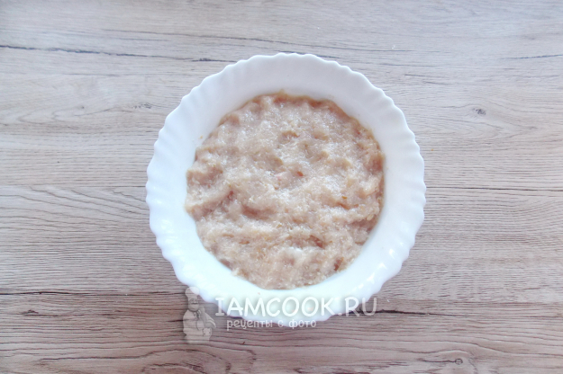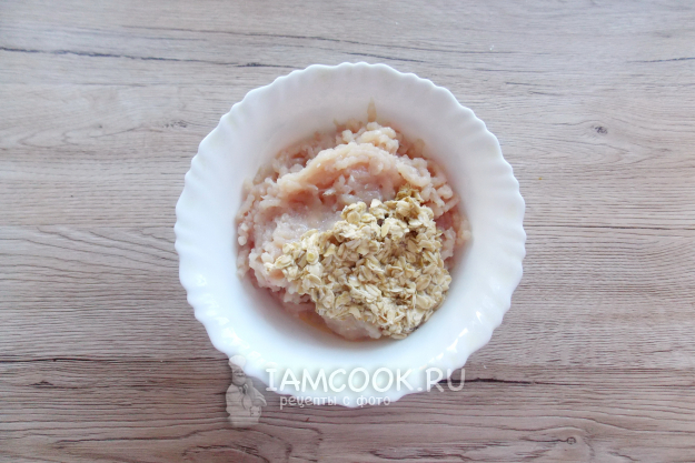 Затем добавьте в куриное филе. Набухшие овсяные хлопья можно измельчить в блендере или в мясорубке.