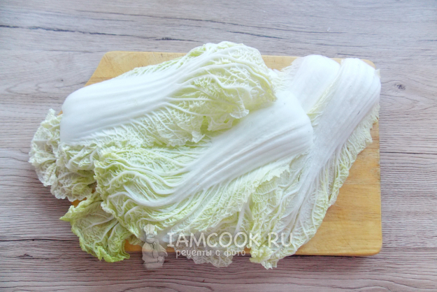 Пекинскую капусту разберите на листья. Обрежьте немного толстую часть листа вдоль. Обдайте листья кипятком.