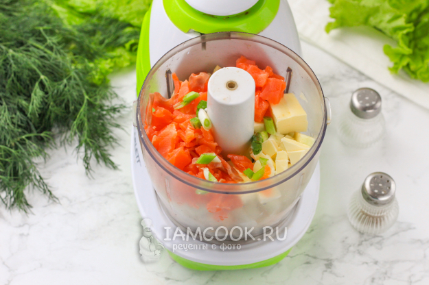 Нарежьте ломтики слабосоленой форели и сливочное масло. Добавьте к остальным ингредиентам вместе с измельченным зеленым луком. Посолите.