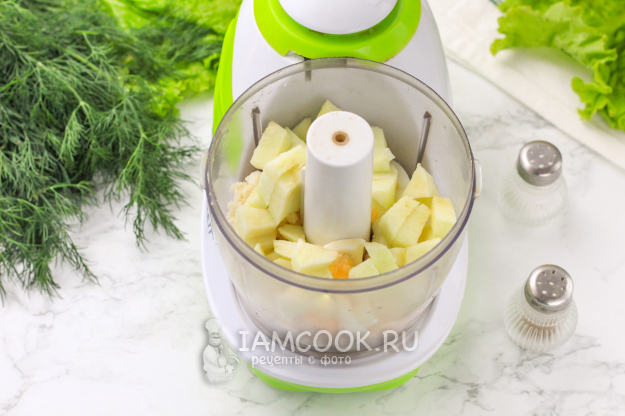Очистите зеленое яблоко от кожуры и семян, промойте и нарежьте кубиками прямо в чашу измельчителя.