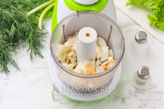 Очистите отварные яйца и промойте в воде. Отожмите мякиш от молока и добавьте вместе с яичной нарезкой в чашу измельчителя.