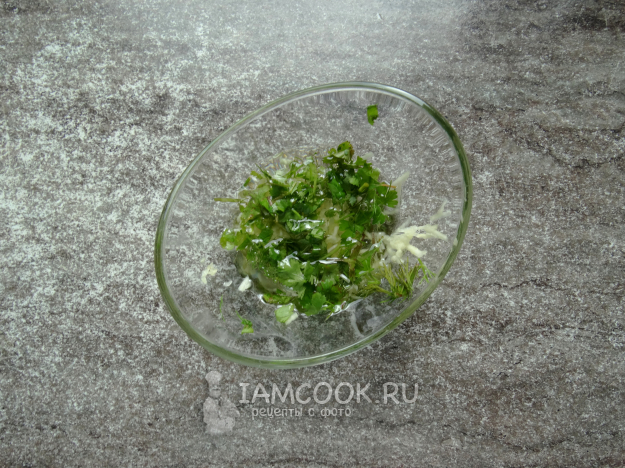 Чеснок и зелень измельчить, залить маслом.