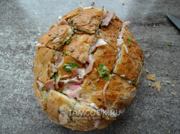 В отверстия при помощи ножа протолкнуть бекон по всей булке.