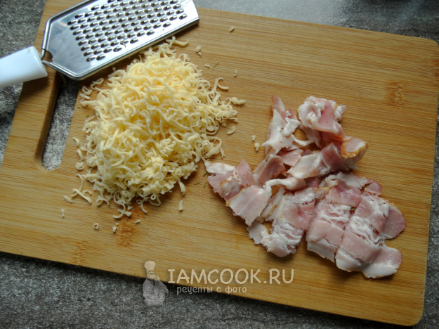 Сыр натереть на мелкой тёрке, бекон нарезать кусочками.