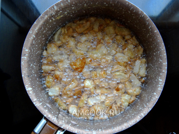 Жарить на сильном огне до румяного состояния, затем достать шумовкой.