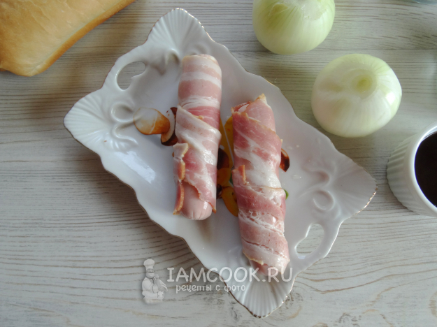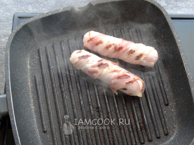 Сосиски в беконе прогреть на сковороде и поджарить.