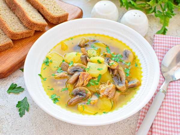 Проварите все вместе 2-3 минуты. В конце готовки можно добавить свежую зелень. Грибной суп с тушенкой готов!