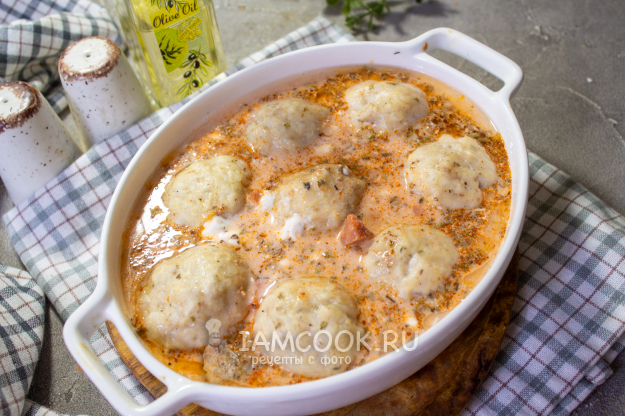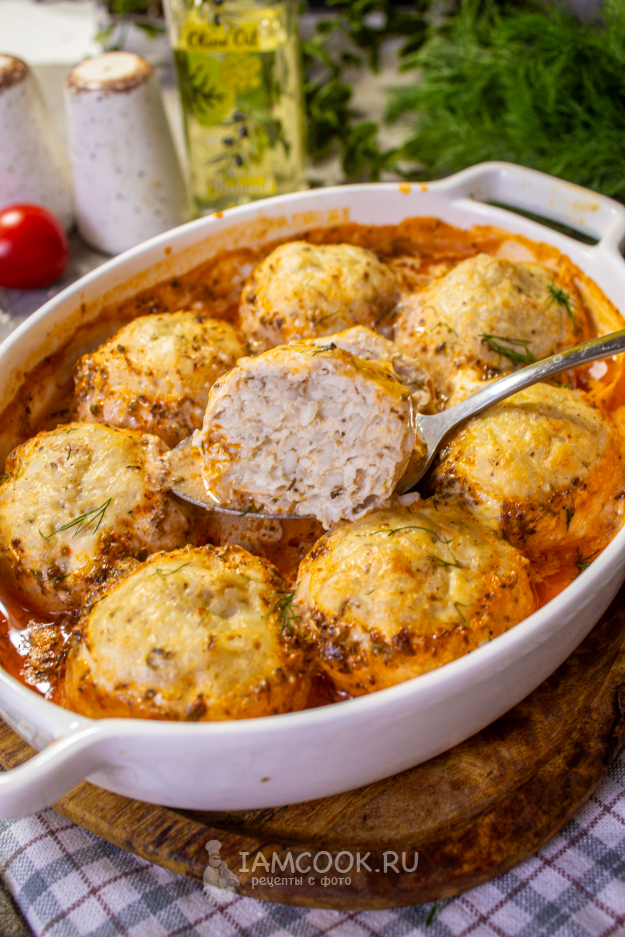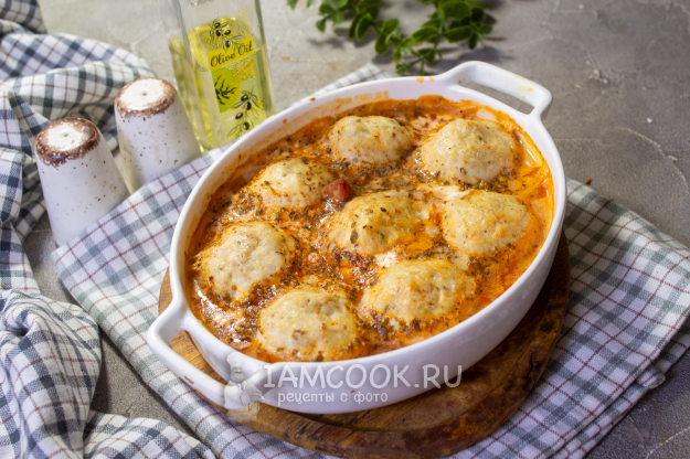 Достаньте форму с тефтелями из духовки. За это время они слегка схватились и теперь не развалятся при выпекании в соусе.