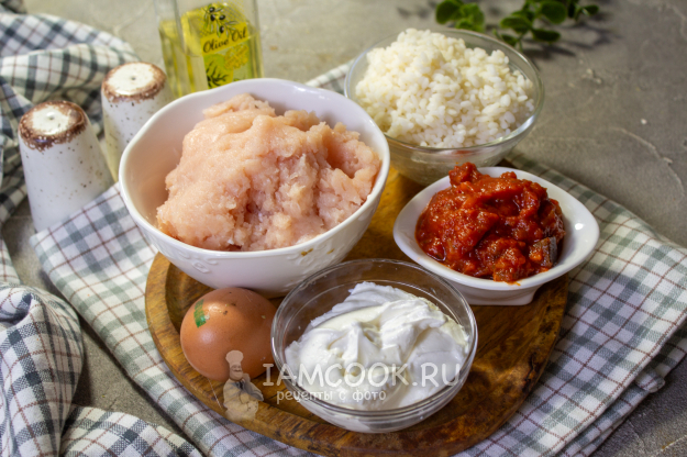 Соберите все необходимые продукты для приготовления куриных тефтелей в томатно-сметанном соусе. Сметана для этого рецепта подойдет любой жирности, главное, чтобы она была вкусной и не кислой. Можете взять томатную пасту или томатный соус, на ваш вкус. Рис (в идеале круглозерный) желательно предварительно отварить (промыть, залить водой соотношении 1:2 и варить до готовности), или используйте тот, который у вас остался после обеда или ужина. В фарш можете добавить любые овощи, можно добавить лук или натертую морковь - так тефтели будут ярче и сочнее.